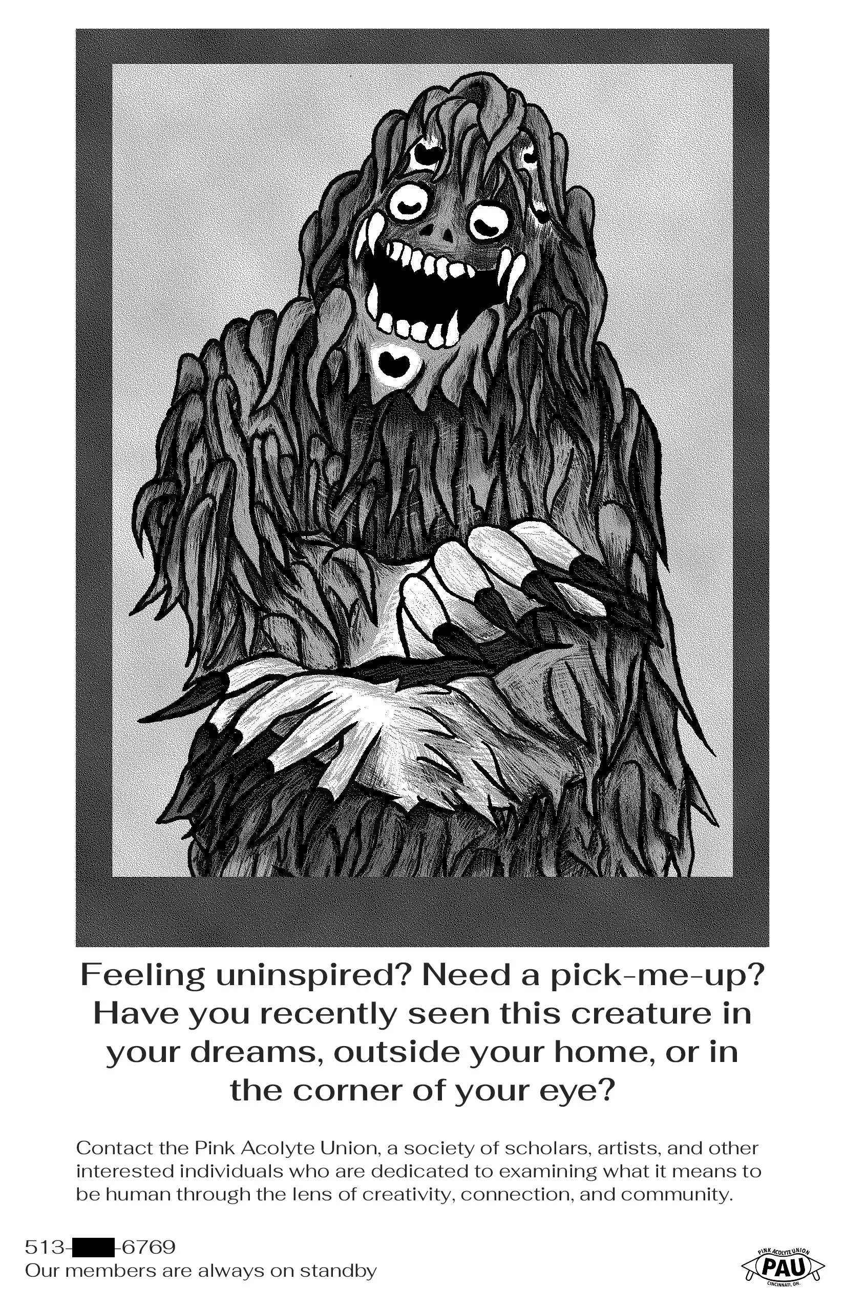 The Terrifying Pink Thing is a cryptid similar to Bigfoot or the Ohio Grassman that has been haunting the southern Ohio area (and possibly beyond) for at least the last 250 years. Known by multiple names, most frequently das rosenungetüm, or the “rose ogre”, the TPT stands around 6’4” and is estimated to be approximate 350-400 pounds. The TPT is also an alternate reality game that utilizes multiple websites, spaces, videos, performances, and objects to tell its story. Based on archival research and counterfactual narrative methodologies, the artworks and artifacts within the collection are fictional yet speculative to the many stories from primarily marginalized populations that have gone under documented. The project acts to critically examine the role of archives in determining what stories are/are not worth preserving and critique nonprofit and academic institutions.